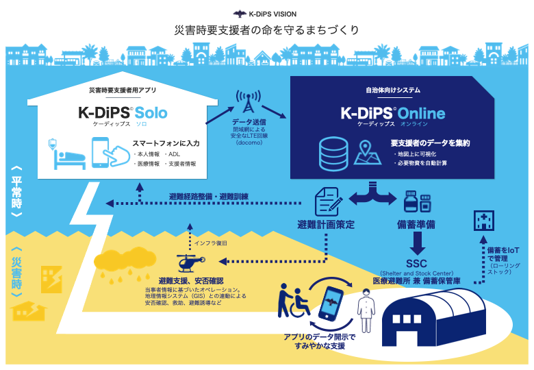 K-DiPS SoloとK-DiPS Onlineの連携によって、地域の実情に合わせた備えの体制整備の実現を目指しています。
